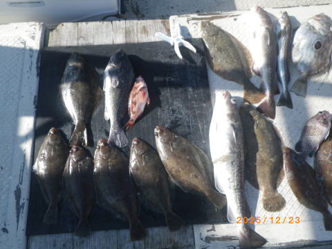 12/23 船中マダラ3匹、ヒラメ5枚、スケソウダラ、ナメタ、水草ガレイ、ウスメバル、ソイ、マトウダイ