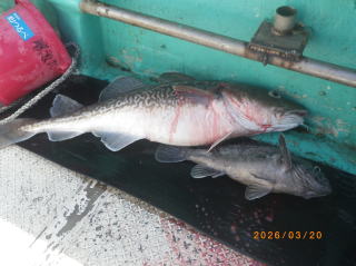 3/10 2週間ぶり久々の出船、ジギングでタラ狙い1~5匹70~90㎝良型が揃った、黒メバル、マゾイが混じった、時化後で濁りがきつく苦戦しましたが、300gジグで釣果が上がった。