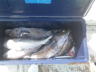 3/22 タラジギングで出船、5~12匹、60~80㎝、アブラメ、黑メバルが混じった。