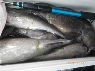 1/27 タラジギングで出船、10~29匹(船中87匹)、60~100㎝、凪が良く爆釣でした。