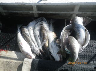 2/13 タラジギングと胴突き五目釣りで出船、ジギングで真鱈0~3匹船中5匹、助宗タラ、ソイ、メバル混じり、胴突き仕掛けでソイ、助宗タラ、アブラメ、メバル、カサゴ、ミズクサカレイ等、好調でした。