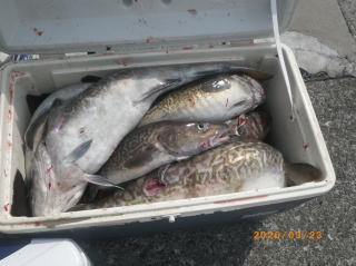 3/10 2週間ぶり久々の出船、ジギングでタラ狙い1~5匹70~90㎝良型が揃った、黒メバル、マゾイが混じった、時化後で濁りがきつく苦戦しましたが、300gジグで釣果が上がった。